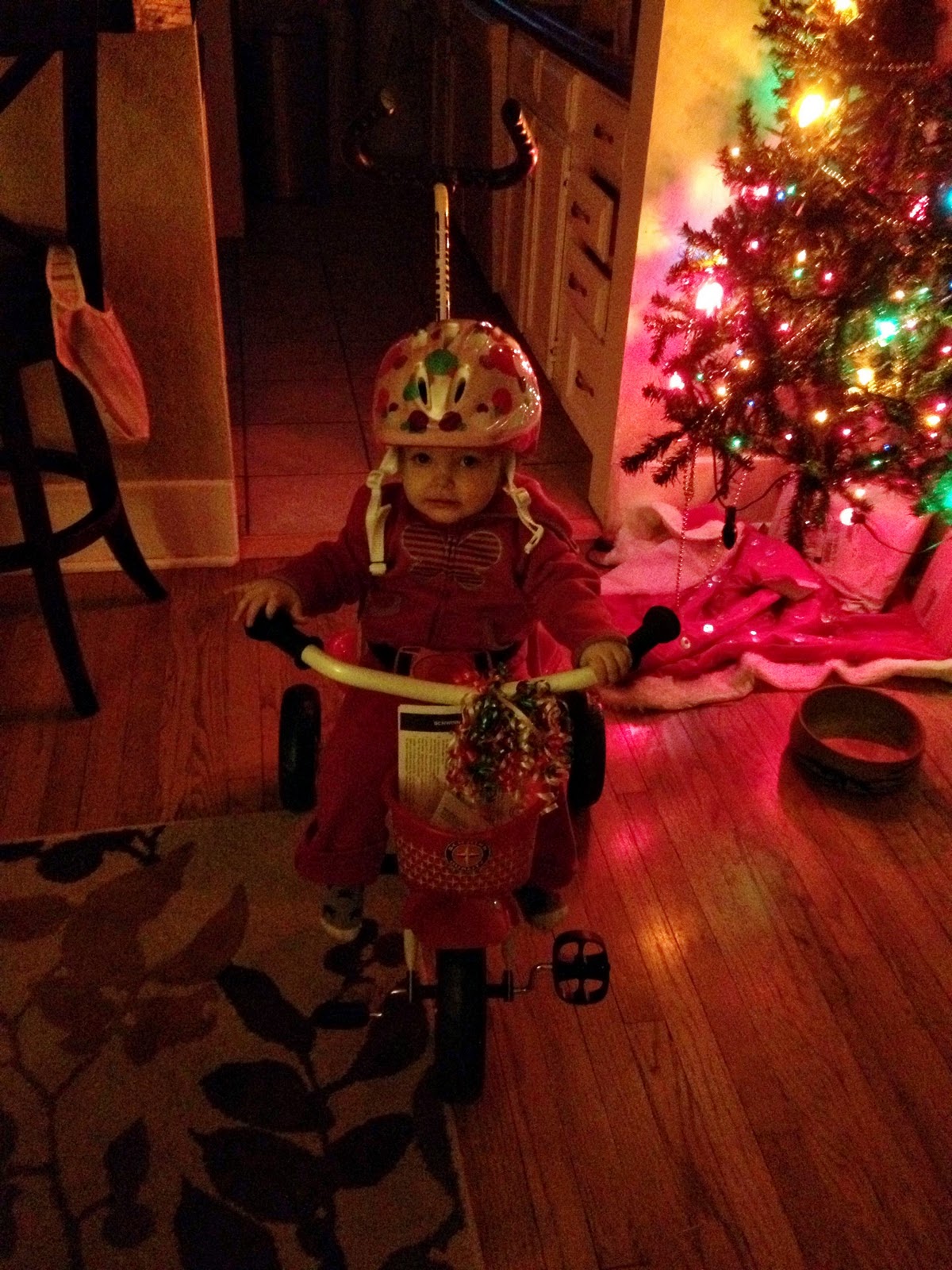 Junebug got a shopping basket/cart with food from Lilly and Aunt Holly and Uncle John gave her a sweet tricycle and helmet. She LOVES it. She also has now learned (in less than 24 hours) to pull herself on it and get down, complete with a proud smile and look around once she gets up!