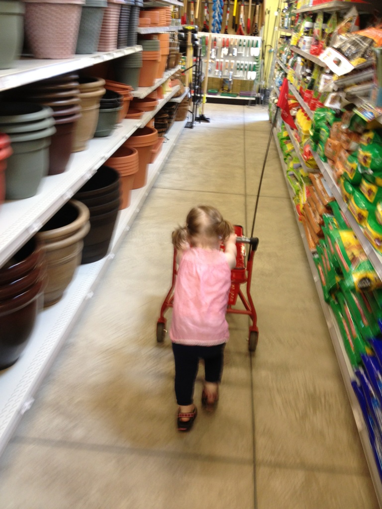 What a great helper for shopping! Kate got a little cart from a garage sale, and it was terrific to have with us. We made a list with pictures and words, and she had a couple of coupons for each aisle so she could match them to the products as we went along. We shopped during the day so she didn't get in the way of the big carts in the busier shopping hours or run over by some of the hurried shoppers. It took some organizing ahead of time, but she had a blast and learned so much! It was all I could do to keep a straight face while she selected just the right apple or banana to put into her cart. Some things were bigger decisions than others, of course.